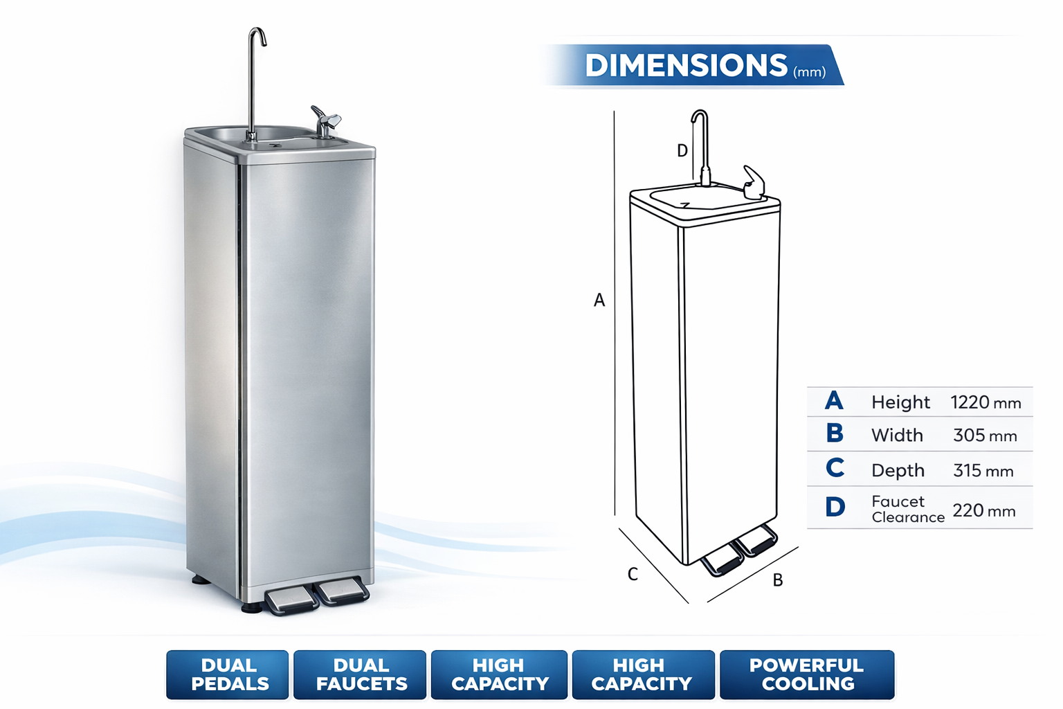 A x B x C x D: 1220 x 305 x 315 x 220 mm